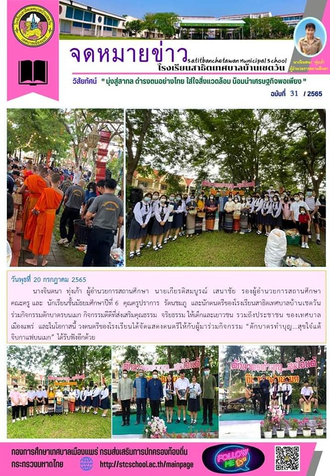 วันที่ 20 กรกฏาคม 2565 คณะผู้บริหาร คณะครู และนักเรียนสายชั้นมัธยมศึกษาปีที่ 6 ร่วมตักบาตรบนเมก "ตักบาตรทำบุญ สุขใจ๋แต้ จิบกาแฟบนเมก"